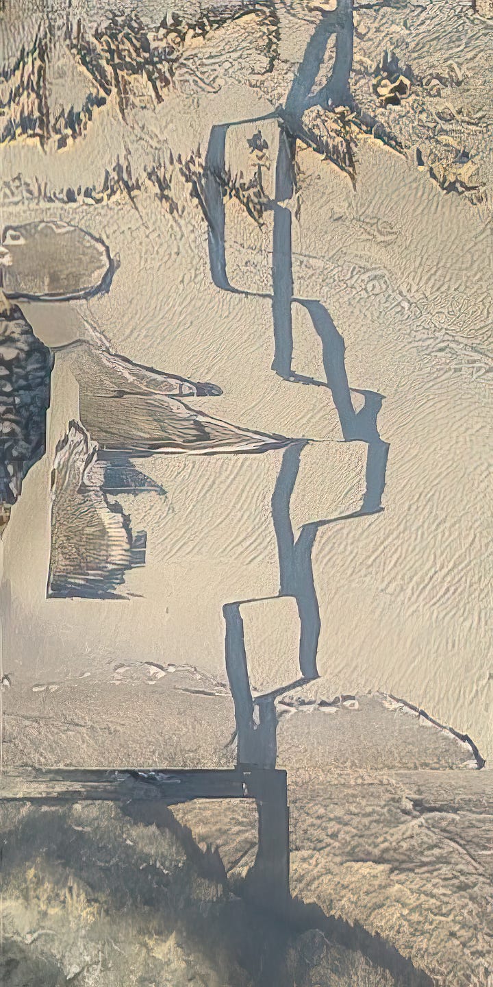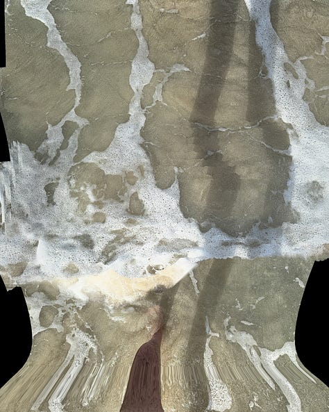 That is what made it so satisfying. At the threshold of beach and sea, with hot sun at my back and its heat in the sand, I could feel the limits of my tool and the limits of my own control. Feet in water, then feet in sand, walking the seam where the world keeps changing. Drawing, erasing. I followed the shifting cast of shadows as if they were threads. Sometimes the stitches held. Sometimes they buckled. Sometimes they produced something I could never have planned.